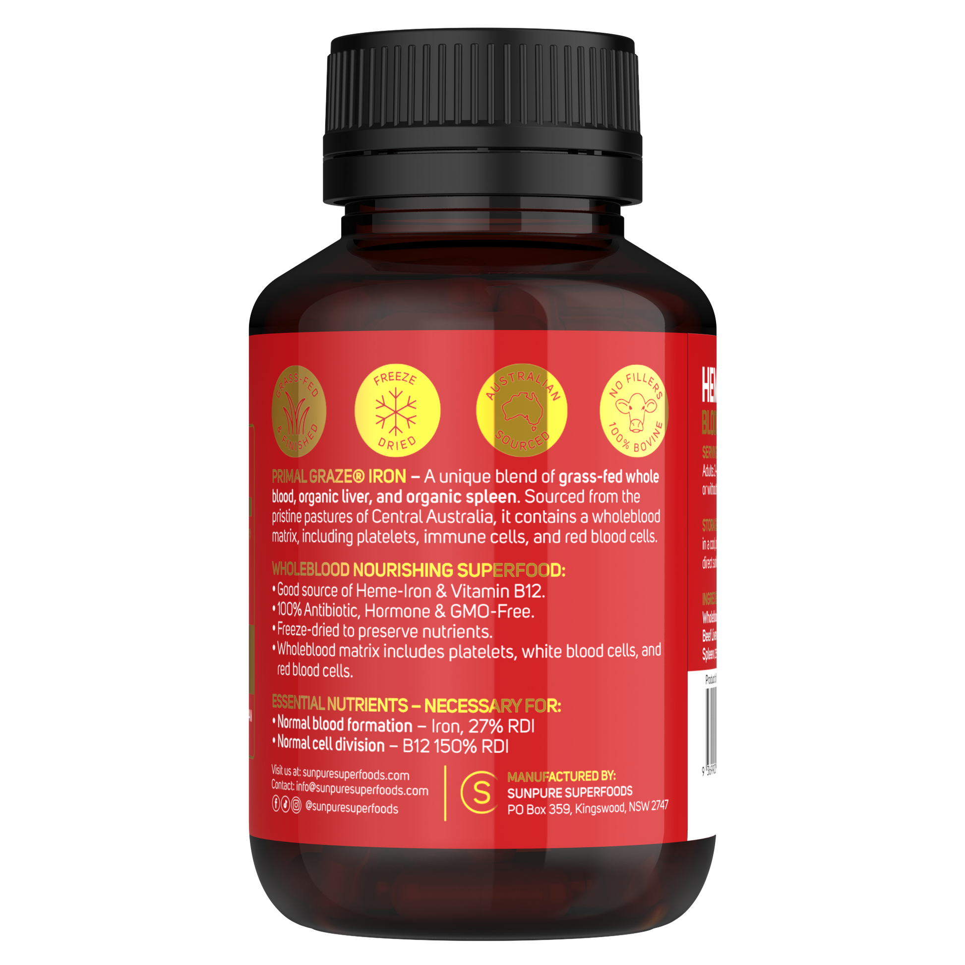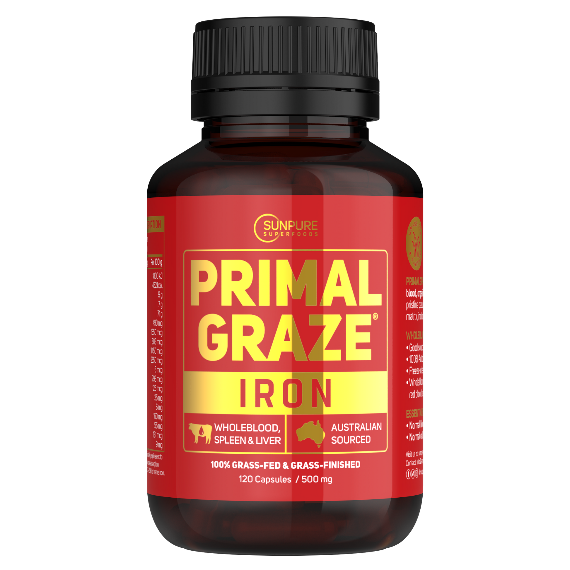 Primal Graze™ Iron – Experience the nutrient-rich benefits of our grass-fed whole blood, with added organic spleen and liver capsules. Made from only the highest quality, pasture-raised cattle, our whole blood supplement is filled with essential vitamins and minerals for optimal health. Improve your well-being with nature's superfood.