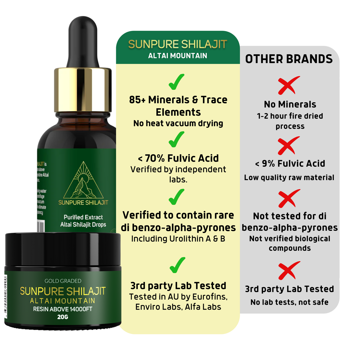 Sunpure Shilajit undergoes rigorous third-party testing. Our gold-grade shilajit is free from heavy metals and contaminants, offering you a safe and effective natural superfood. Choose Sunpure Shilajit for an authentic, superior-quality product.
